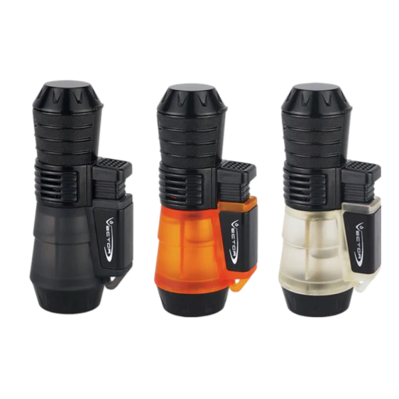 Isqueiro Vector Triforce Jet-Flame de jato resistente ao vento, com três chamas. Depósito transparente.