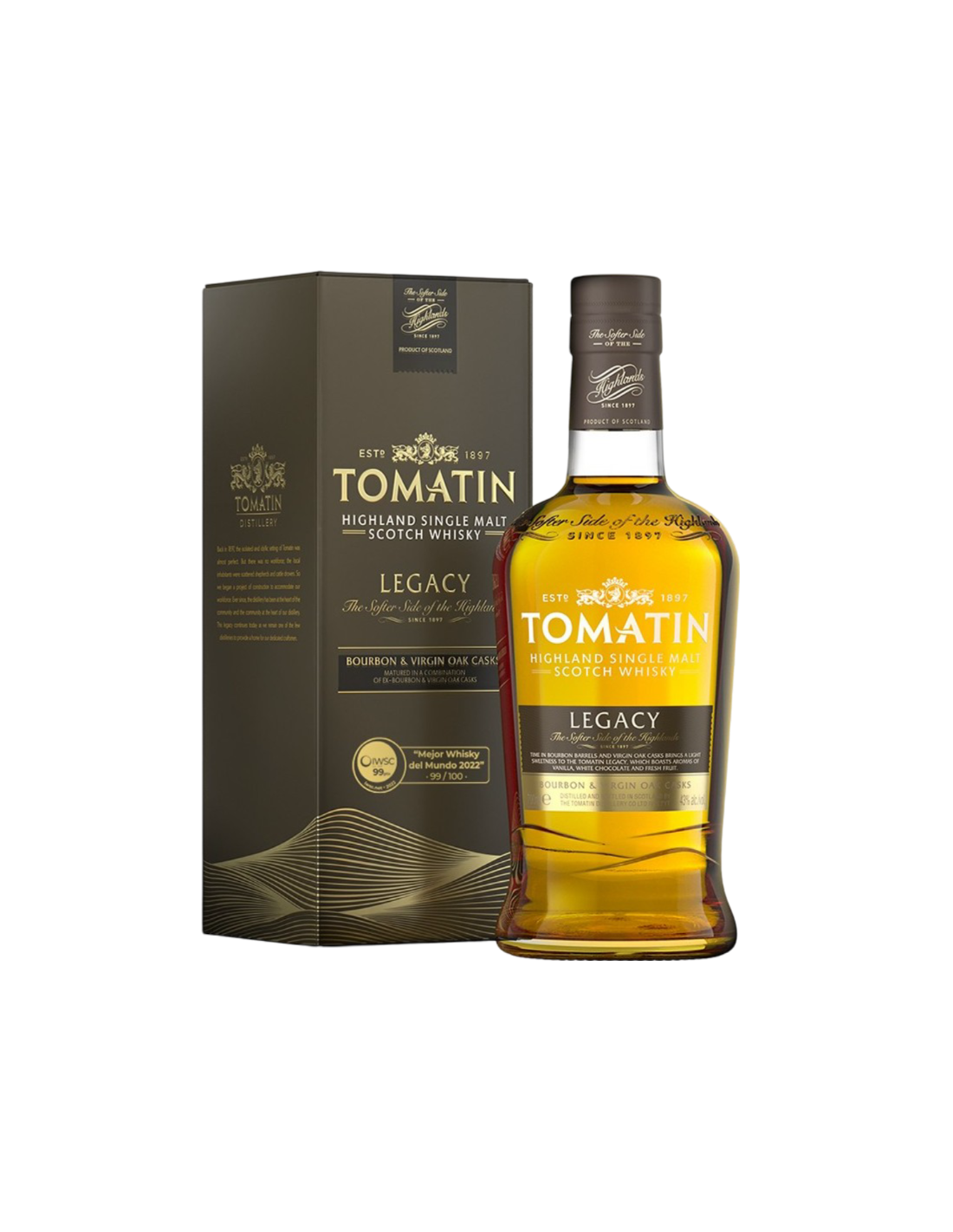 Whisky Tomatin Legacy de malte amadurecido, fruto de uma combinação de barris de Bourbon e barris de carvalho virgem. Proveniente das terras altas da Escócia, conquista o mundo com sua leve doçura e agradável frescura.
